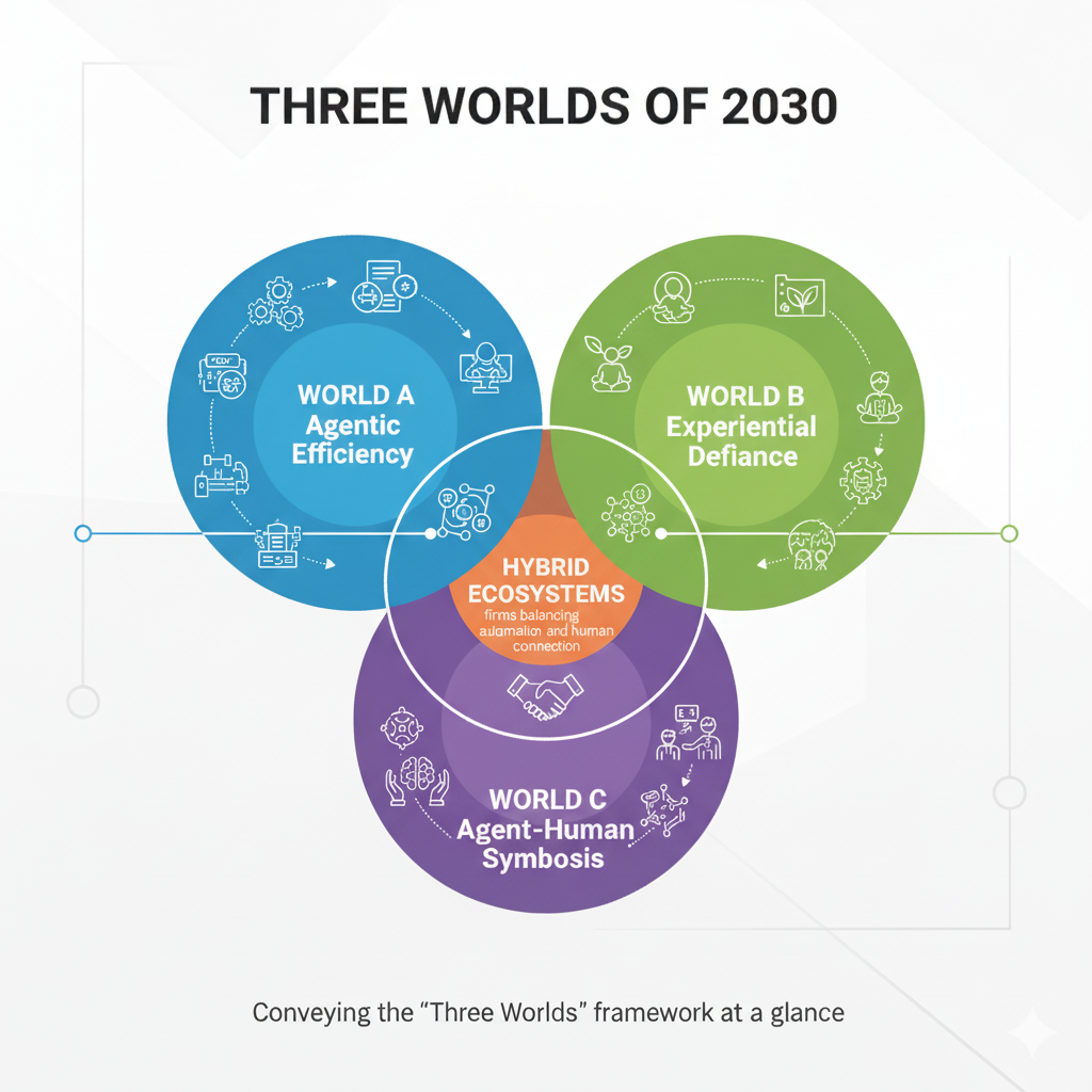 - World A – Agentic Efficiency (~60%)The world of automation and precision. Here, AI agents dominate transactions, optimizing for price, speed, and availability. Brand identity matters less than clean data and fulfillment reliability.Dominant value driver: Data precision and automation.